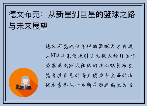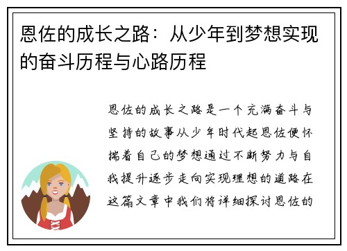 恩佐的成长之路,是一个充满奋斗与坚持的故事。从少年时代起,恩佐便怀揣着自己的梦想,通过不断努力与自我提升,逐步走向实现理想的道路。在这篇文章中,我们将详细探讨恩佐的成长历程,分为四个方面:追寻梦想的初心、面对挑战的不屈精神、支持团队的重要性以及心灵成长的蜕变。每一个阶段都展现了恩佐在实现梦想过程中所...